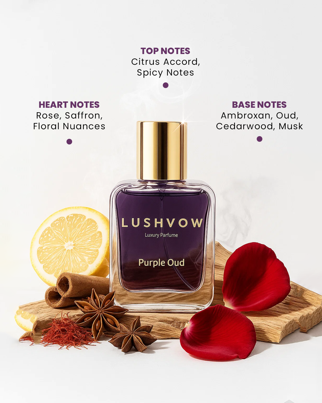 Lushvow Purple Oud is a luxurious unisex fragrance blending oud, saffron, and Ambroxan for a deep, opulent scent experience. Bold, elegant, and long-lasting, it embodies oriental refinement and royal confidence for memorable occasions.
